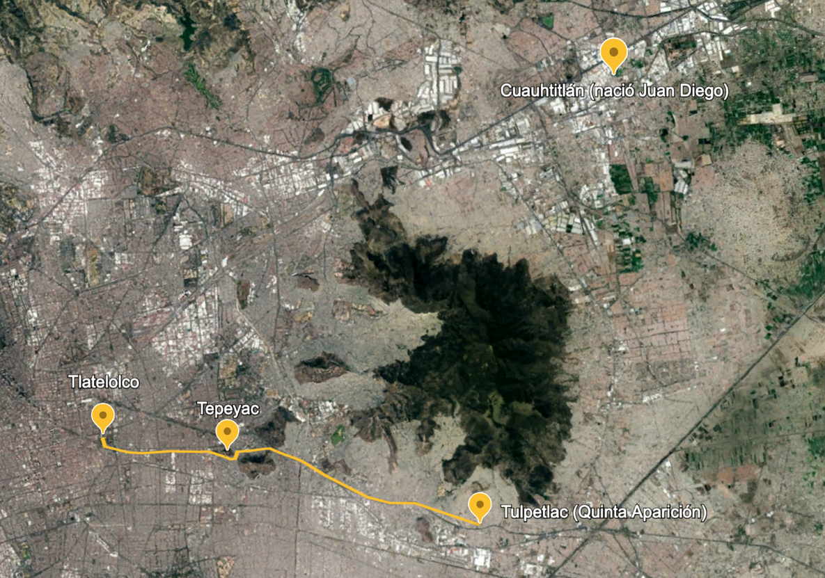 The road made by Juan Diego, on December 12, 1531, was from Tulpetlac to Tlatelolco, passing through Tepeyac. It is implausible to think that he left Cuautitlán, since the usual route from Cuautitlán to Tlatelolco does not pass through Tepeyac (both in Juan Diego's time and in our days). If Juan Diego goes from Tulpetlac to Tlatelolco, he will pass through Tepeyac, which was one of the access roads to reach the Church of Santiago in Tlatelolco. Now, if he had come from Cuautitlán it was not necessary for him to pass through Tepeyac, because the road that came from Cuautitlán to Tlatelolco did not pass through Tepeyac. Even more, if Juan Diego was in a hurry on the day of the fourth apparition and naively wanted to avoid meeting the Virgin, the most logical thing would be for him to advance in a straight line along the road that comes from Cuautitlán and that reached Tlatelolco without passing through Tepeyac.