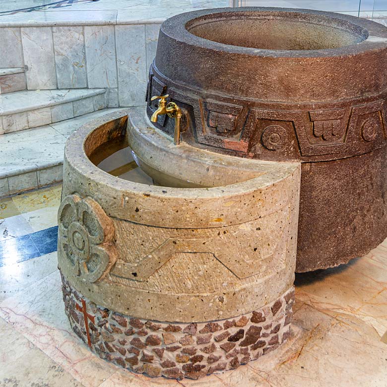 The Sanctuary harmoniously combines a variety of architectural elements. This construction is inspired by Arabic style, from the root of the name “Guadalupe”, which comes from this language, meaning “River of Light”. The floor plan is a Greek cross, the Latin altar and the “Fountain of Health” and baptismal font are of Nahuatl inspiration. The altarpiece features the majestic oil painting by D. Luis Toral, entitled: “Health of the Sick”, which portrays the miraculous healing granted by Our Lady to Juan Bernardino and the revelation of her name; “Saint Mary of Guadalupe”. On the walls of the naves there is a rich iconography that invites you to contemplate the Guadalupe Event. On the left side of the presbytery there is access to a passage that leads to the feet of the Virgin, the place where Juan Bernardino's hut is represented; a space for contemplation, conducive to prayer and gratitude. Continuing along the corridor, you come out on the right side, where you will find the Fountain of Health, living water that springs from the place, a sign of the Health that Our Mother offers us. Fountain of Health.