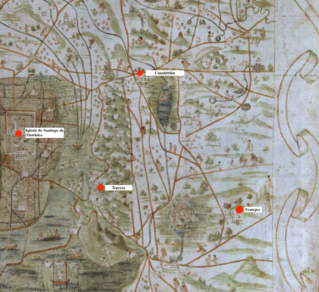 These same routes have existed since the time of Juan Diego as we know from the Map of Uppsala, a plan of the survey of the Valley of Mexico made in 1555. This map was made just a few years after the apparitions, by a Royal Cartographer of Emperor Carlos V, Don Alfonso de Santa Cruz. It is currently located in the Uppsala University Library, Sweden. It was made known through a copy made in the lithographic workshops of the Swedish army and hand-colored in Madrid in 1982 at the Colombian Exhibition. We see that the route that Juan Diego took going from Tulpetlac (Ecatepec) towards Tlatelolco was necessary to pass through Tepeyac, while the map also shows us that going from Cuautitlán to Tlatelolco one does not pass through Tepeyac, since there is a direct route (to this day).